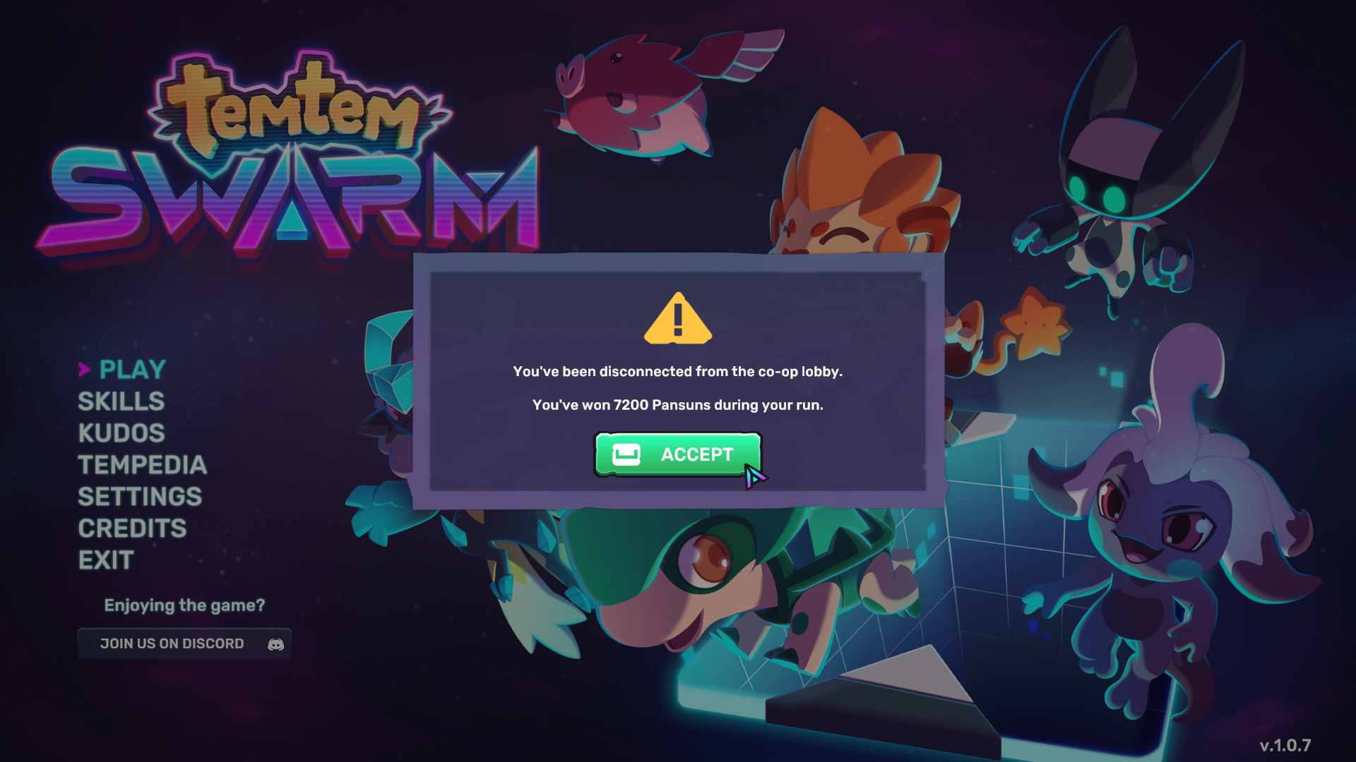• We’ve made the online system a bit more tolerant to errors, so that it will not immediately cause a disconnection upon finding an issue. Right now the disconnection is automatically happening, even with errors that are pretty harmless and don’t interfere in the successful completion of a match. This will hopefully allow everyone to suffer less disconnections, and make the Swarm experience a bit more enjoyable.